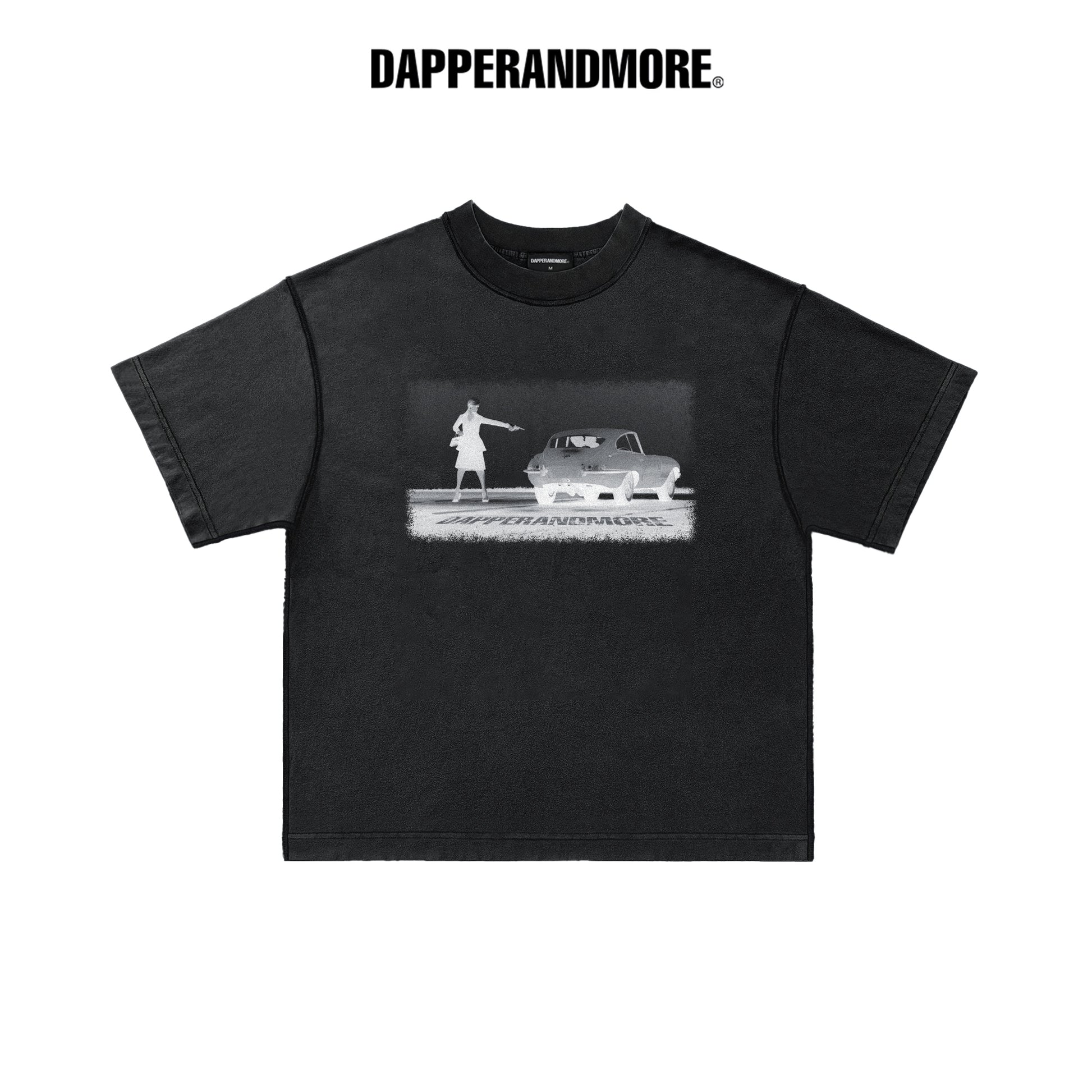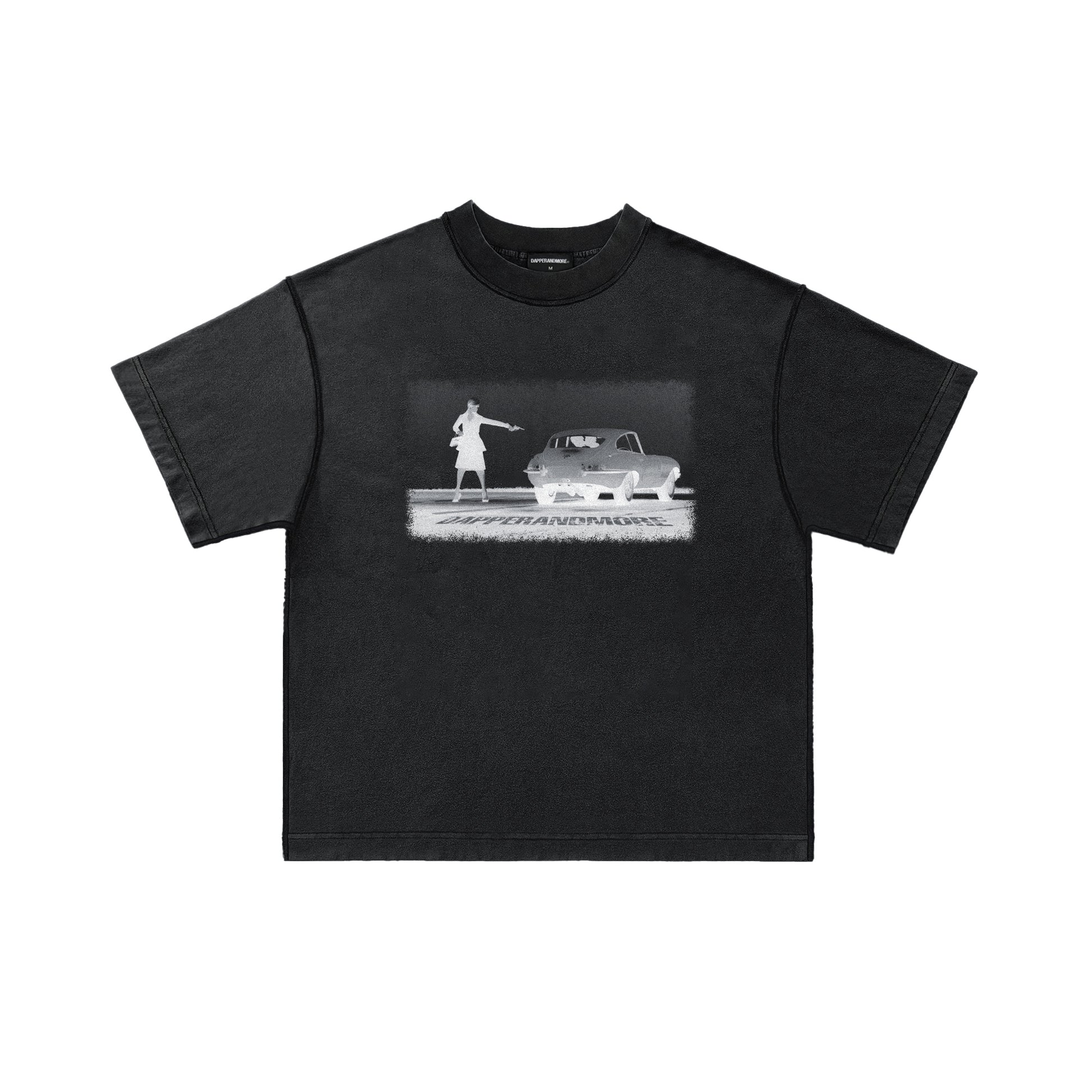 החולצה מעוצבת בסגנון Noir (שחור-לבן), ויוצרת תחושה דרמטית המזכירה סצנה מתוך סרט פעולה.