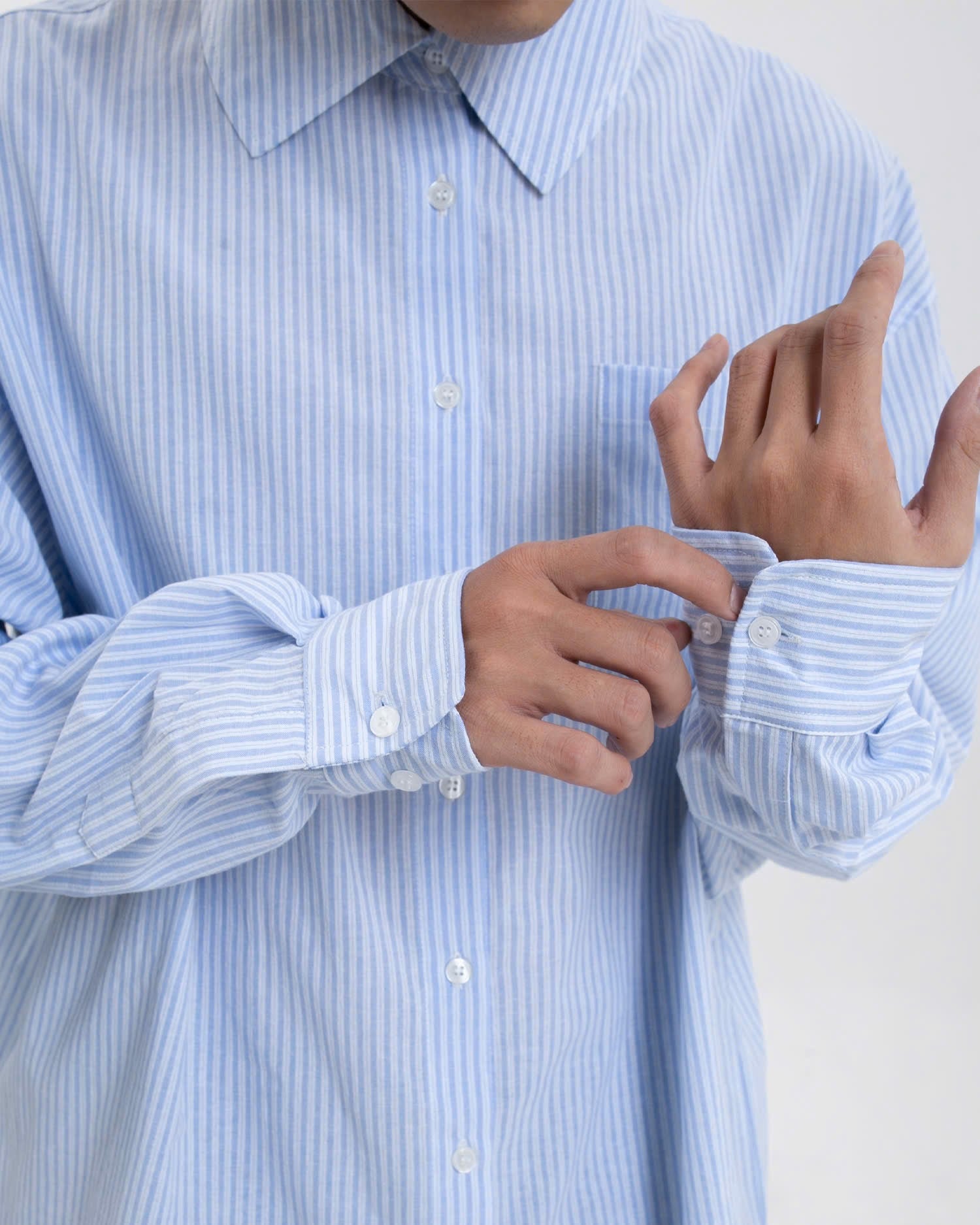 חולצה מכופתרת רחבה בעיצוב אלגנטי ונקי, עשויה מבד כותנה קליל ואוורירי בגוון תכלת פסים דקים.