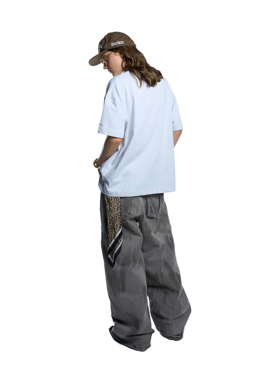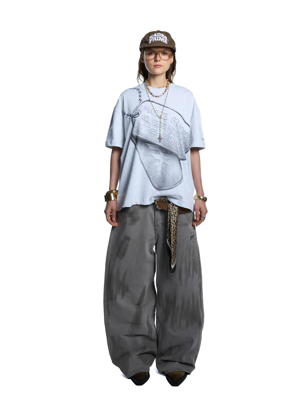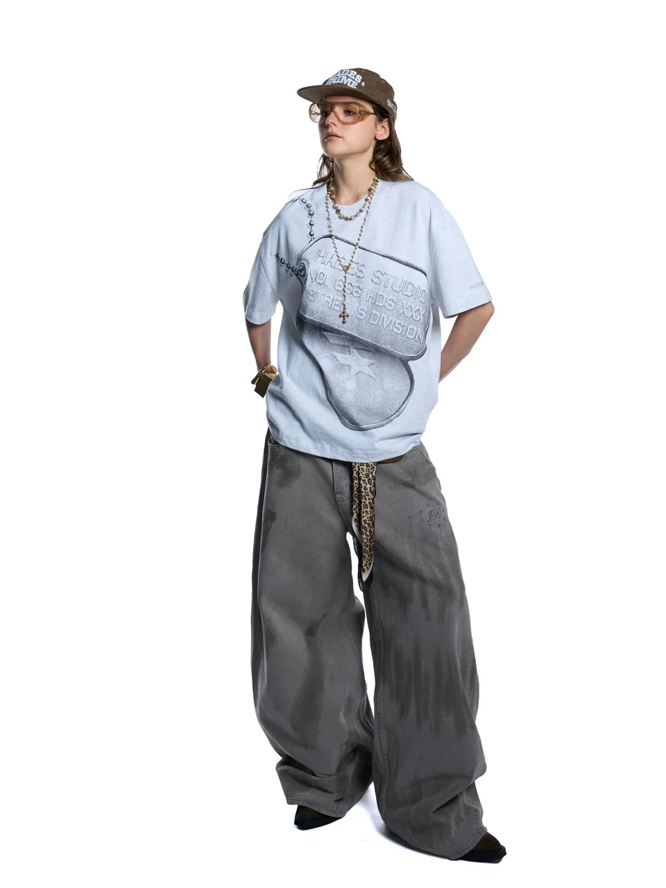 חולצת אוברסייז יוניסקס בגוון אפור בהיר עם הדפס גרפי בולט של תגי זיהוי צבאיים (Dog Tags) בגוון מטאלי.