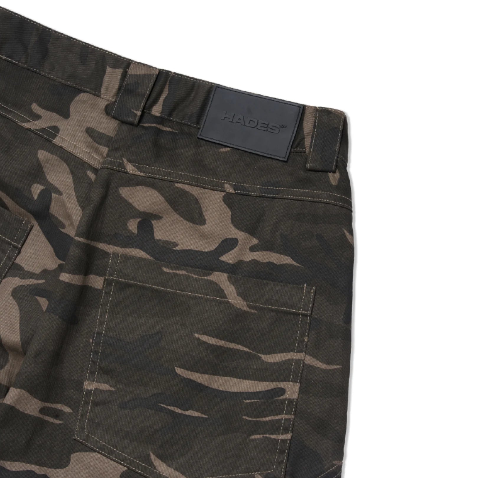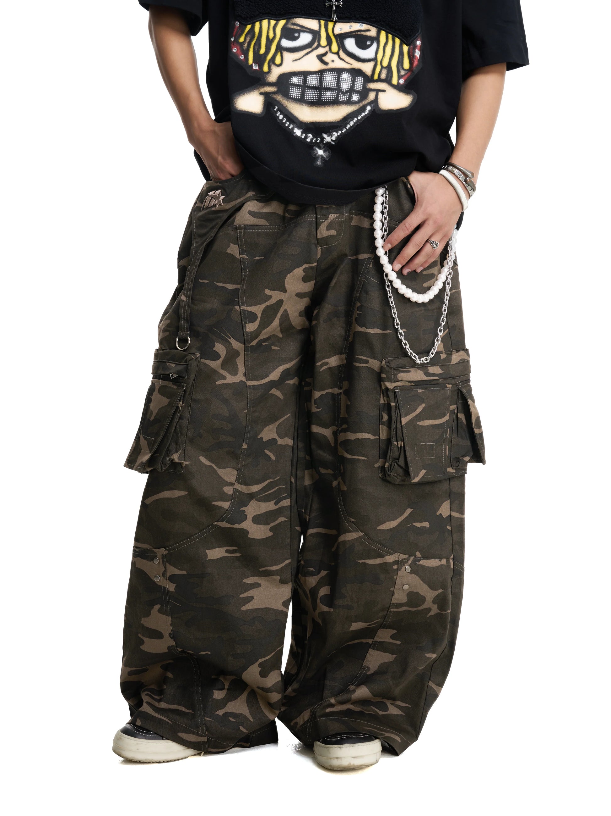מכנסי יוניסקס בגזרת קרגו רחבה עם הדפס קמופלאז' בגוון חאקי כהה.