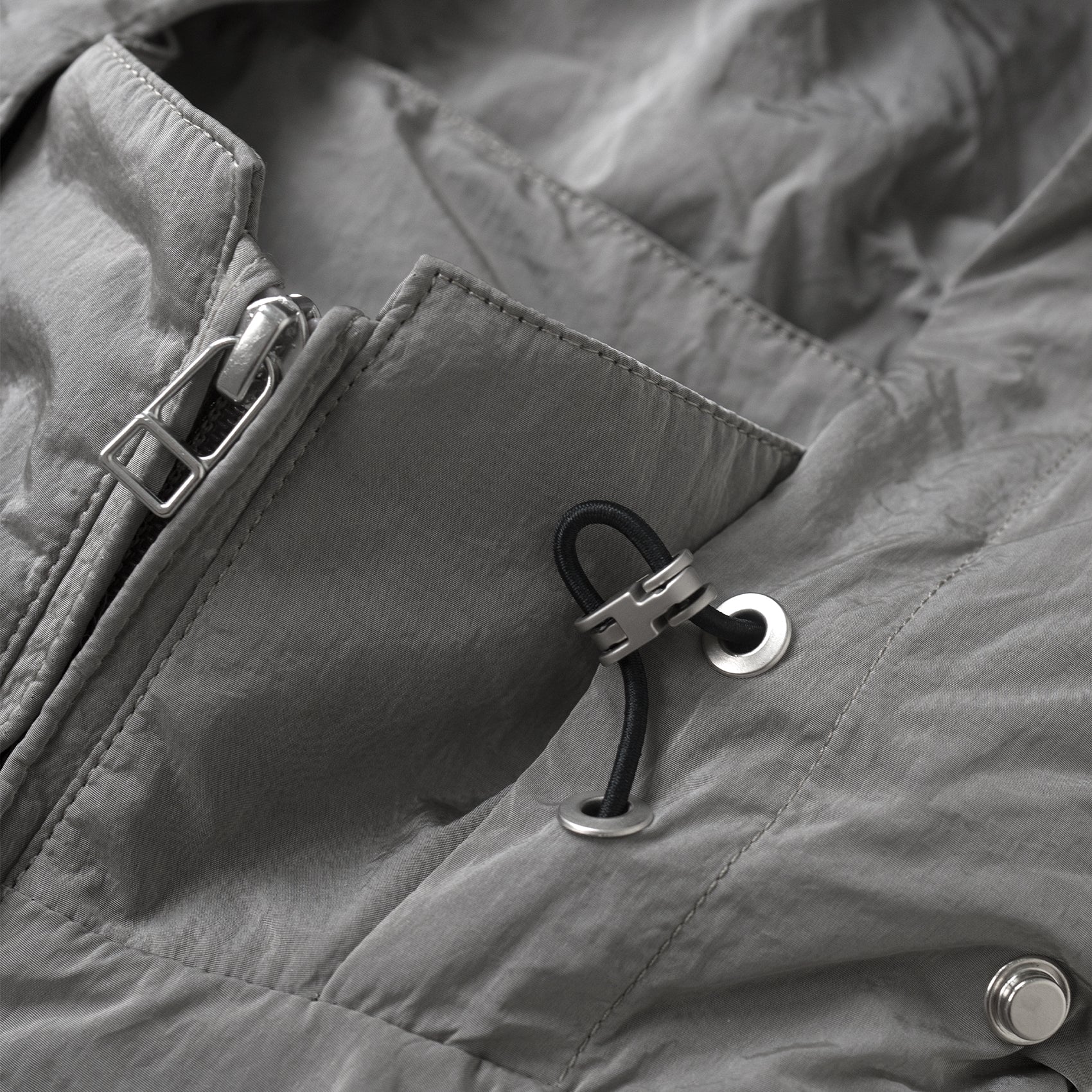 העיצוב כולל קפוצ׳ון שניתן לקיפול לתוך הצווארון באמצעות כפתורים, ומשלב אלמנטים טכניים ודגש על גימור מדויק ואלגנטי.